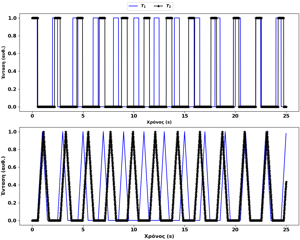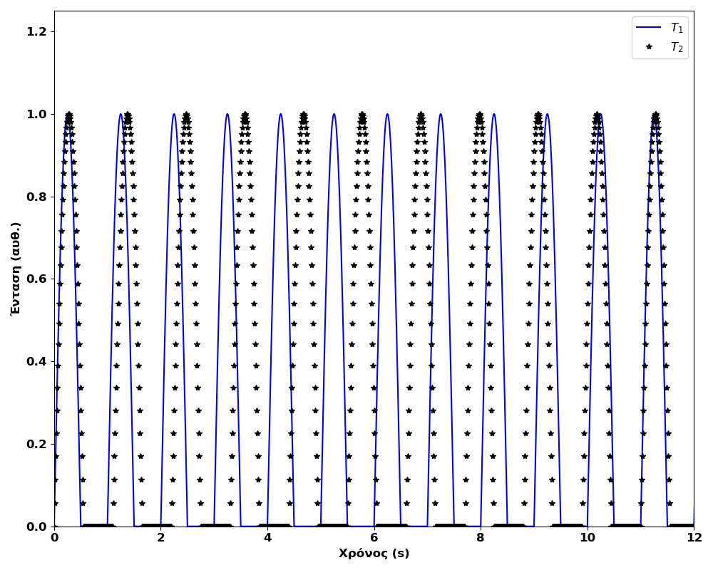 Στο ίδιο συμπέρασμα θα καταλήξουμε αν χρησιμοποιήσουμε και άλλες περιοδικές συναρτήσεις (π.χ. τριγωνικό ή τετραγωνικό κύμα) ή πιο σύνθετες, όπου μπορούμε να λάβουμε υπόψη και τυχόν διαφορές στη διάρκεια του μεγίστου. Αυτή η επιλογή πιο πολύ περιγράφει το “πώς” αντιλαμβανόμαστε με το μάτι μας τη λειτουργία του φλας1. Οι μικρές διαφορές στη συχνότητα θα οδηγήσουν τελικά σε έναν φαινόμενο συγχρονισμό (Εικόνα 2).