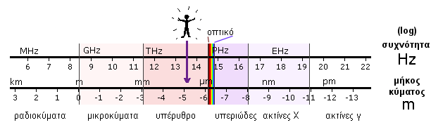 Αυτό γίνεται επειδή, όταν κάτι λάμπει λόγω της θερμοκρασίας του, η συχνότητα όπου έχει την μεγαλύτερη λαμπρότητα εξαρτάται από εκείνη τη θερμοκρασία. Όσο μεγαλύτερη είναι η θερμοκρασία του, τόσο μεγαλύτερη είναι και η συχνότητά του. Ας κοιτάξουμε το ηλεκτρομαγνητικό φάσμα (Εικόνα 2). Οι τυπικοί άνθρωποι, που έχουν μία θερμοκρασία δέρματος γύρω στους 36°C, εκπέμπουν σε μία συχνότητα στο υπέρυθρο. Έτσι δεν βλέπουμε ο ένας τον άλλον μέσα στη νύχτα με τα μάτια μας, αλλά μπορούμε να ιδωθούμε με διόπτρες υπερύθρων. Όταν (κατά προτίμηση όχι σε ανθρώπους) η θερμοκρασία αυξηθεί αρκετά ώστε η συχνότητα να είναι ορατή στο οπτικό τμήμα του φάσματος, αυτό που βλέπουμε είναι το κοκκινο άκρο του. Μετά, όσο αυξάνει η συχνότητα, πηγαίνουμε στο κίτρινο και κάποια στιγμή1 φτάνουμε στο άλλο άκρο, όπου είναι το μπλε, προτού οι συχνότητες χαθούν ξανά από την όρασή μας, αυτή τη φορά στο υπεριώδες.